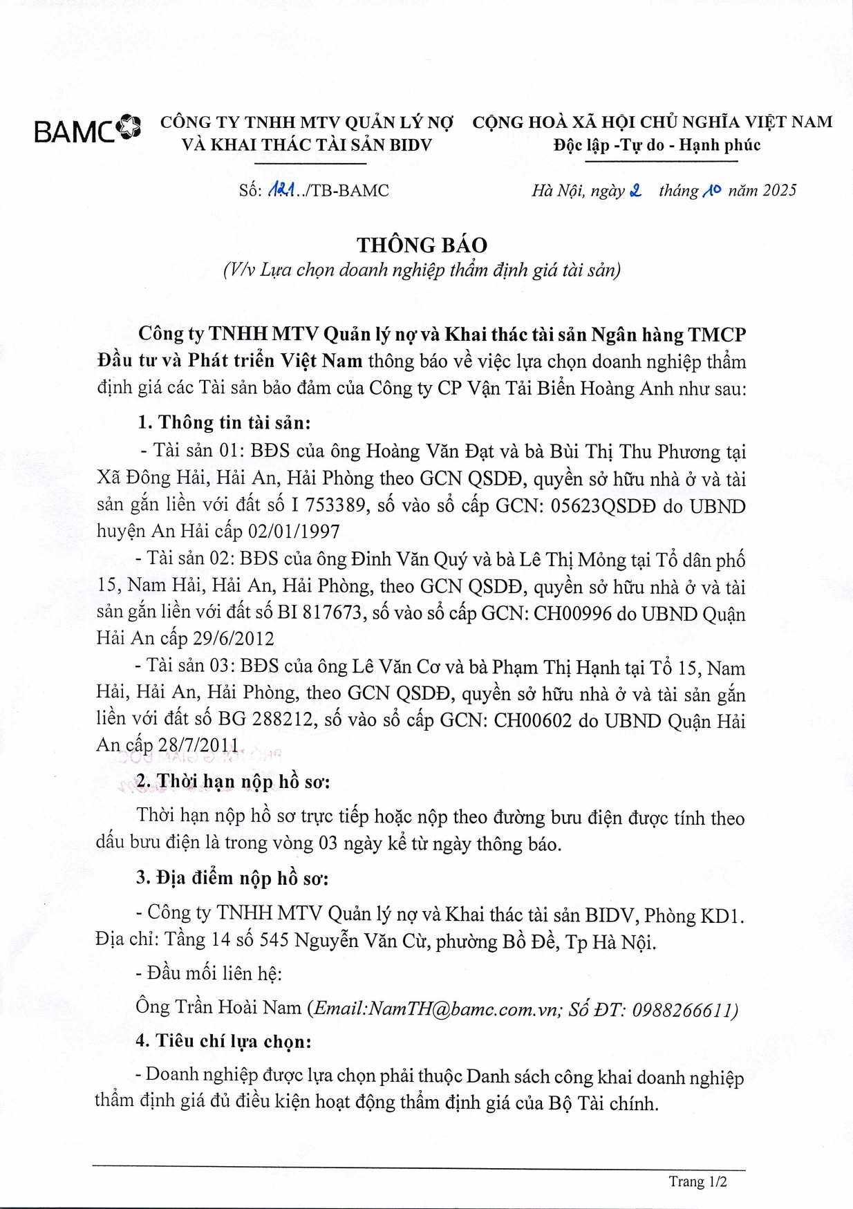 [02-10-2025] Thông báo lựa chọn doanh nghiệp thẩm định giá tài sản – 03 BĐS tại Hải An, Hải Phòng