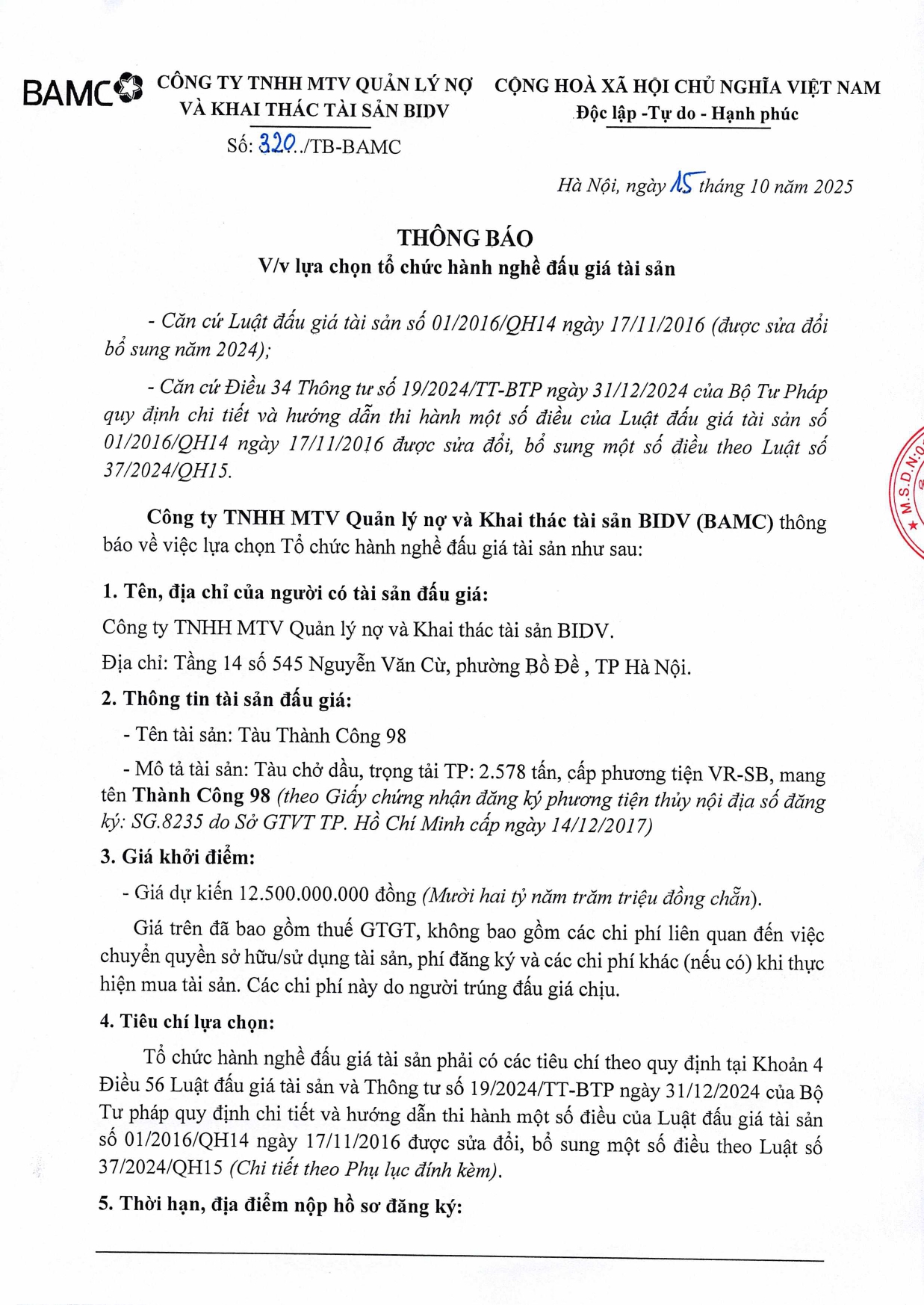 [15-10-2025] Thông báo lựa chọn tổ chức hành nghề đấu giá tài sản – Tàu Thành Công 98