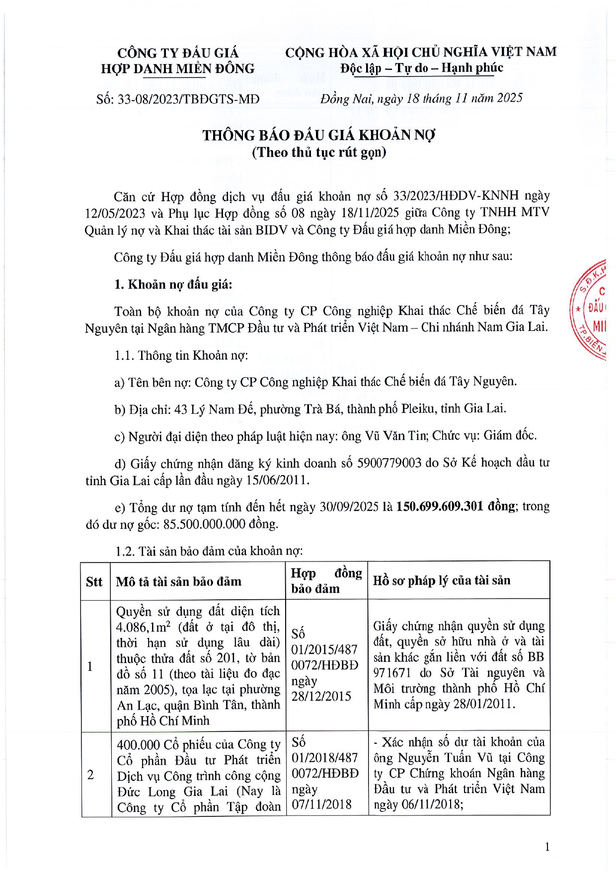 [19-11-2025] Thông báo đấu giá khoản nợ của Công ty CP Công nghiệp khai thác chế biến đá Tây Nguyên