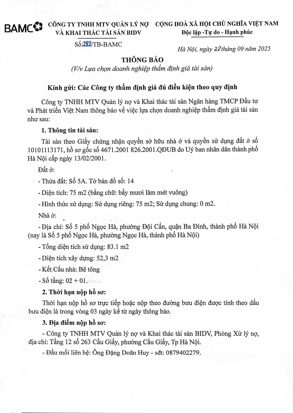 [22-09-2025] Thông báo lựa chọn doanh nghiệp thẩm định giá tài sản – Thửa đất 75m2 tại số 5 Ngọc Hà, Hà Nội